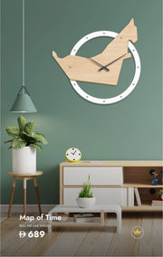 A stunning wall clock crafted from wooden boards, designed in the unique shape of the UAE map. The detailed craftsmanship highlights both cultural identity and timeless design. This is a 3D raised product that adds a premium and dynamic effect, making it a standout décor piece for your home or office.