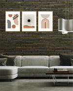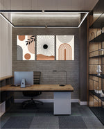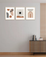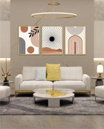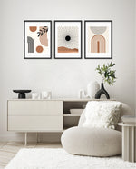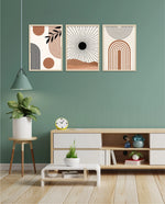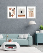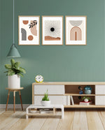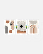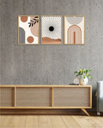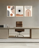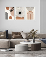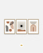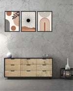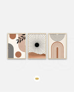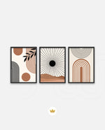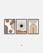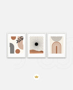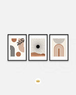 A modern abstract picture frame set featuring sunbursts, desert tones, and geometric arches. Designed in warm earthy shades, these ready-to-hang frames bring a balanced, stylish, and contemporary touch to any dŽcor, ready to hang.