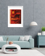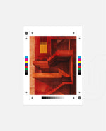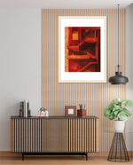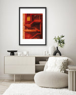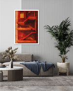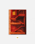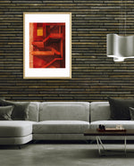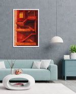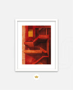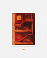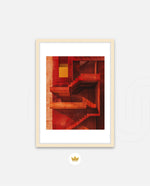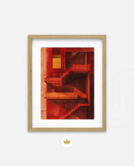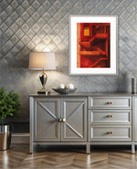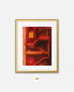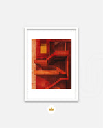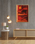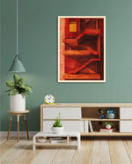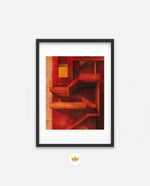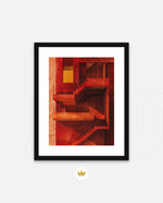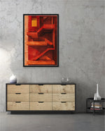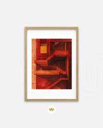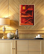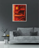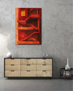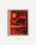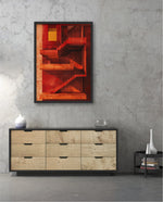 A dramatic architectural artwork of intersecting staircases, bold geometric shadows, and deep red textures, creating a striking maze-like composition filled with depth, mystery, and modern minimalism, ready to hang.