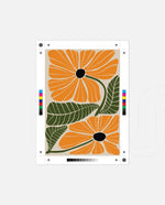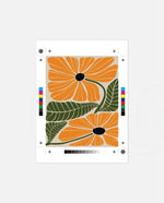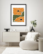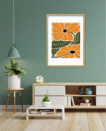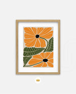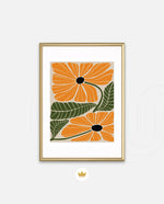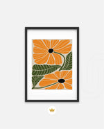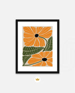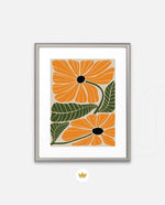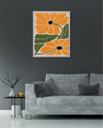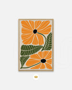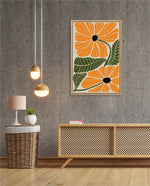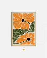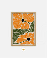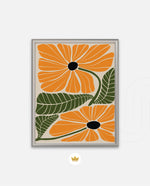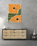A vibrant floral artwork featuring bold orange blossoms with dark centers and lush green leaves arranged in a playful, organic composition, bringing warmth, freshness, and a cheerful modern touch to contemporary wall spaces, ready to hang.