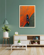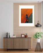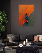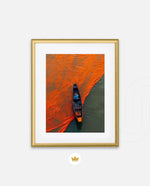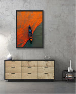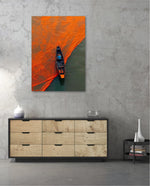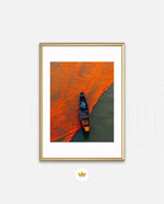 A striking top-view artwork capturing a lone wooden boat gliding between rich amber-toned water and deep green currents, creating a powerful contrast of color, movement, and solitude that evokes quiet focus and visual drama, ready to hang.