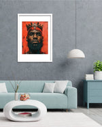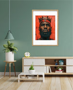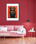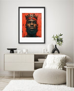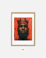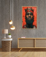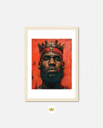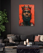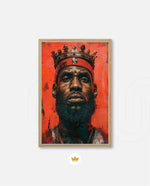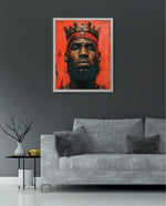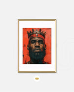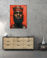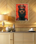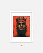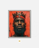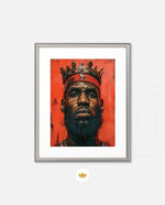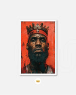 A commanding portrait of a modern icon painted with raw intensity against a fiery backdrop. The crown atop his head symbolizes greatness, power, and the weight of legacy, while the detailed textures highlight determination and resilience. This artwork captures the spirit of a king rising from passion, struggle, and triumph.