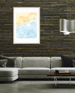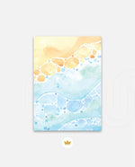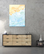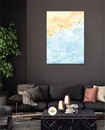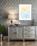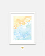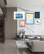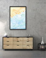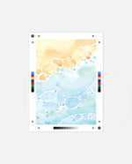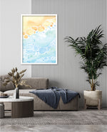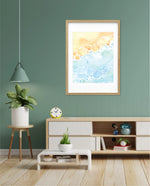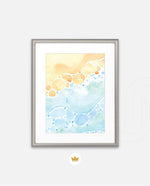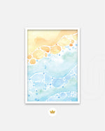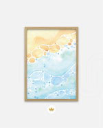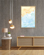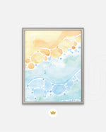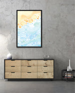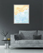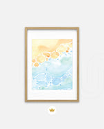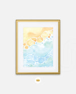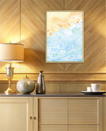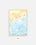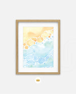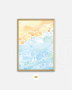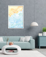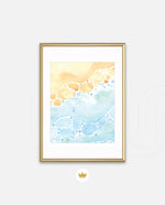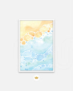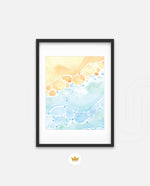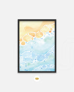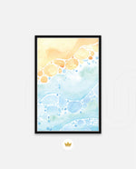 A gentle watercolor artwork blending sandy pebbles with flowing blue waves, creating a soft coastal harmony. This refreshing picture frame adds calm color, movement, and beach-inspired warmth to any space Ñ ready to hang.