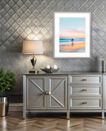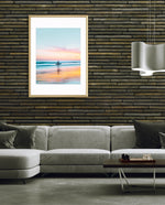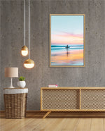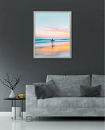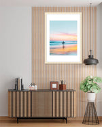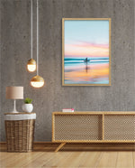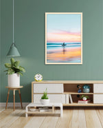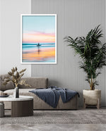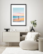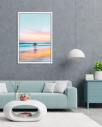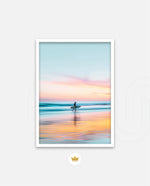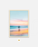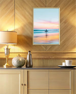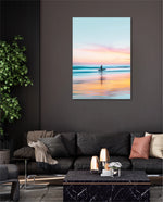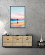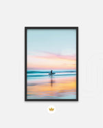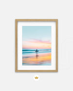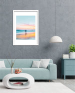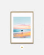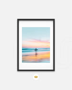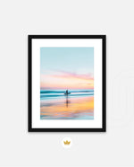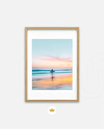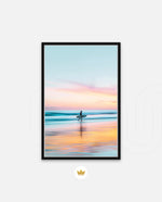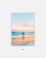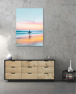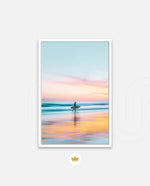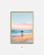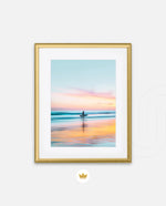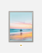A lone surfer walking along a pastel shoreline at sunset, designed as wall art prints and framed wall art for picture frames and photo frames, adding creative wall decor as modern wall art for living room wall art and decorative wall pieces, ready to hang.