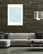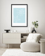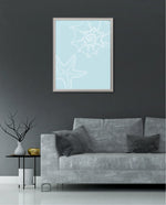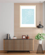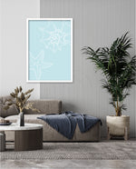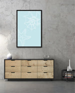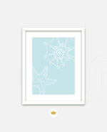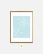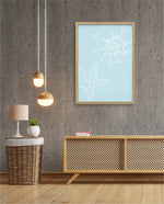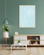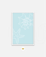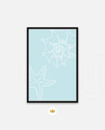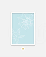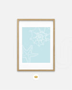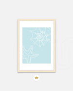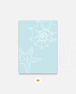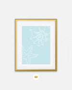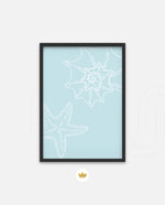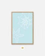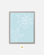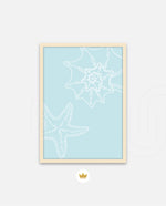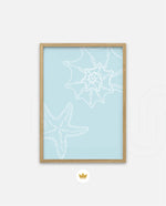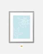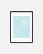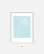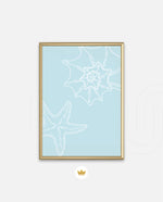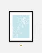 A calm coastal-inspired picture frame featuring delicate line art of seashells and a starfish on a soft aqua background. A refreshing beach vibe that brings serenity to any space, perfect for poolside, living room, or holiday homes Ñ ready to hang.