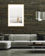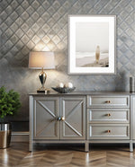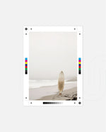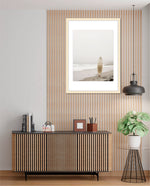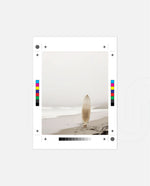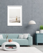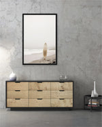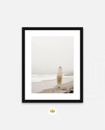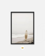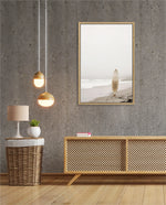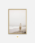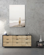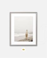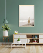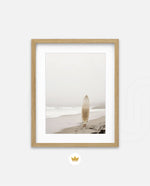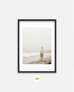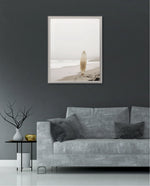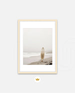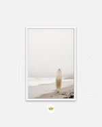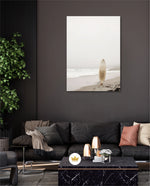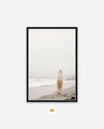 A minimal and calming beach photograph featuring a lone surfboard standing against a misty shoreline. This picture frame brings a peaceful coastal mood, soft tones, and a modern serene aesthetic to any space Ñ ready to hang.