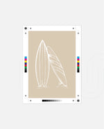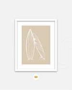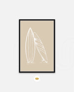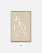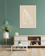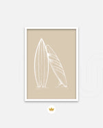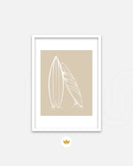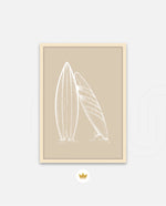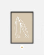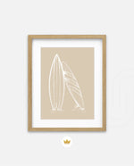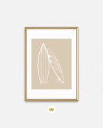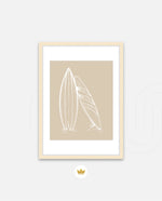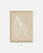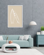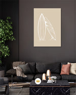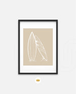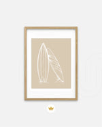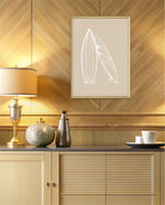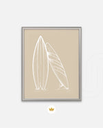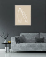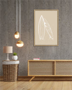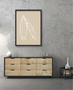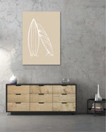 Minimal surfboard line art on a warm sandy background, perfect for beach lovers and pool areas. A calm coastal dŽcor piece, ready to hang.