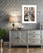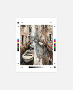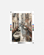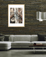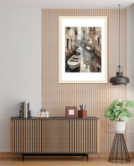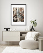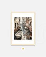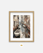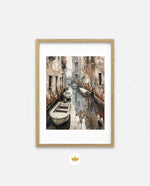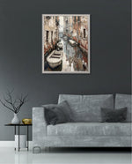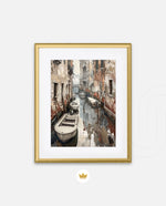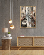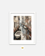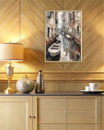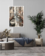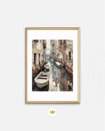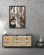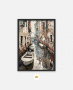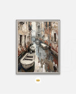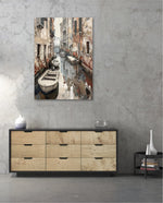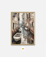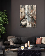 A moody, textured artwork portraying a quiet old canal lined with weathered buildings and gently moored boats, where soft reflections and layered brushstrokes evoke timeless charm, stillness, and the poetic rhythm of life by the water, ready to hang.