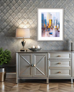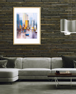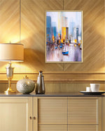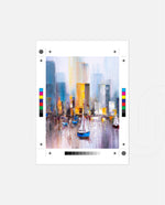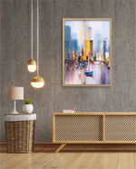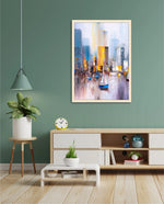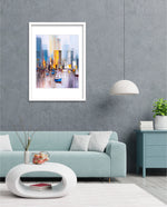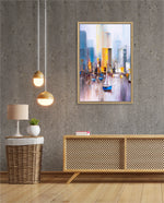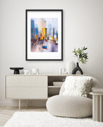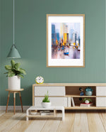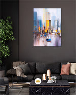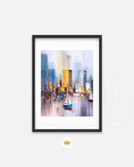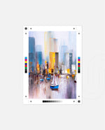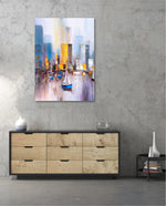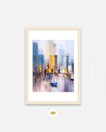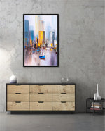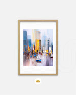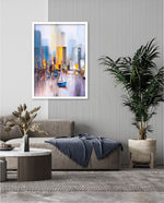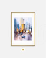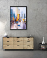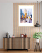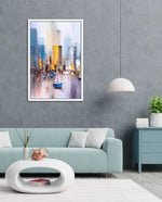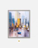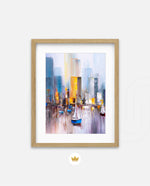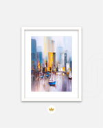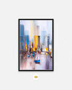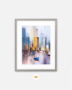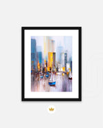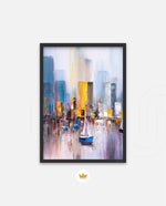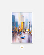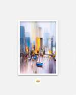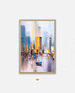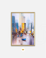 A vibrant abstract cityscape artwork featuring glowing skyscrapers mirrored on calm water, with expressive brush strokes, soft sailboats in the foreground, and a luminous palette that blends urban energy with serene waterfront charm, ready to hang.
