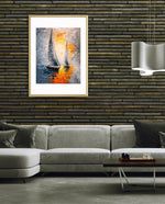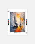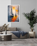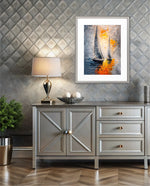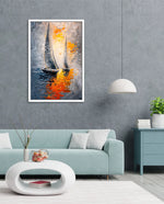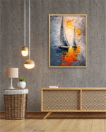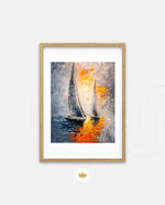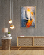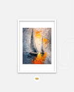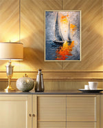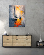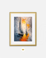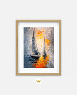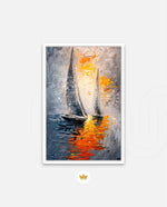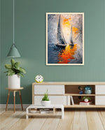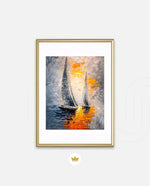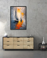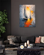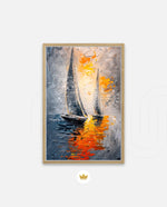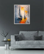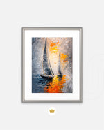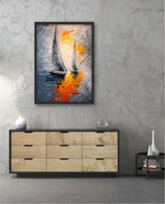 A dynamic nautical artwork of two elegant sailboats gliding across shimmering water, painted with bold palette-knife textures in silver, gold, and deep blue. The glowing sunset reflections create movement, depth, and modern coastal drama, ready to hang.