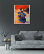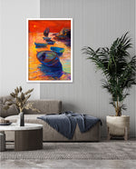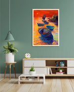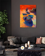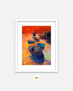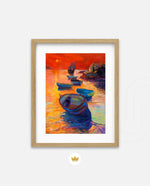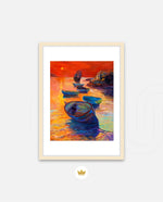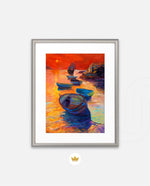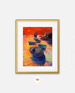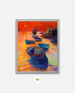 A vibrant seascape artwork featuring small boats drifting on glowing sunset waters, painted in rich oranges, purples, and blues. The warm horizon and reflections create a dreamy, atmospheric moment full of color, depth, and coastal charm, ready to hang.