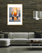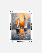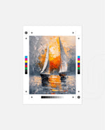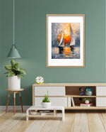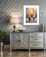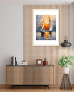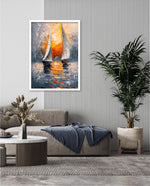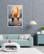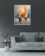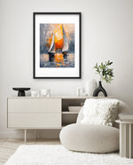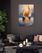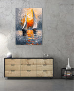 A striking abstract maritime artwork featuring two sailboats gliding across reflective waters, painted with bold textured strokes and dramatic contrasts of silver, grey, and fiery sunset orange, capturing movement, balance, and timeless nautical elegance, ready to hang.