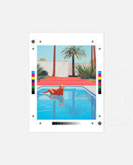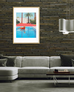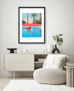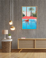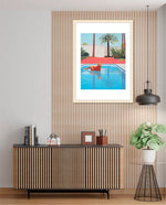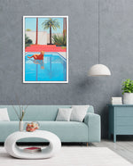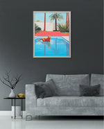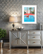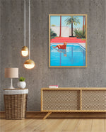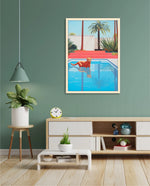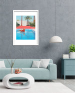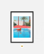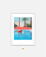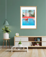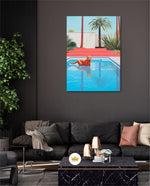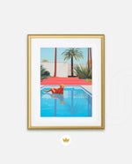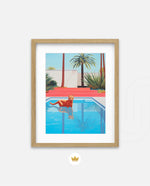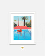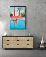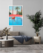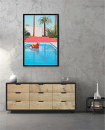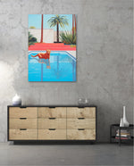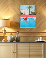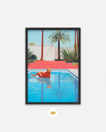 A playful artwork featuring a calm orange cat standing in a bright blue pool, surrounded by modern architecture, palm trees, and soft desert greenery, creating a fun and stylish scene filled with colour and charm, ready to hang.