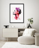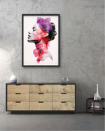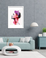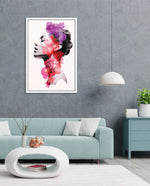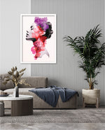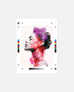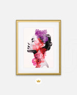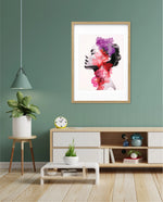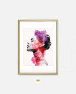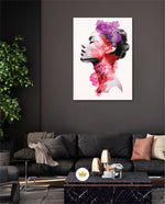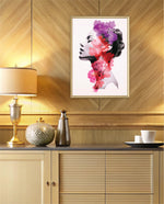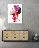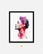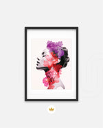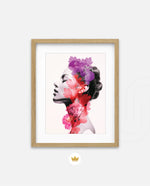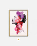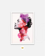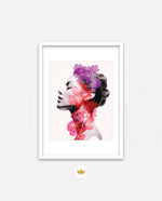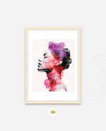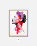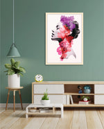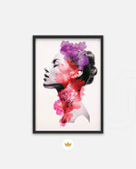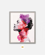 A striking portrait blending feminine grace with vibrant blossoms, symbolizing harmony between nature and inner beauty. The soft grayscale profile contrasts elegantly with vivid florals in pink, red, and violet, creating a sense of depth and surreal artistry. This composition celebrates strength, delicacy, and the timeless connection of humanity with nature.
