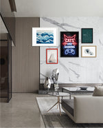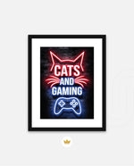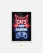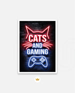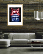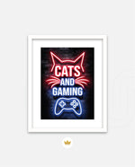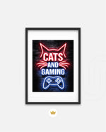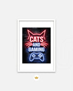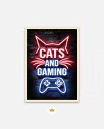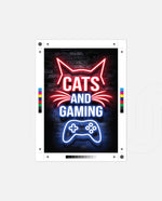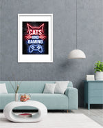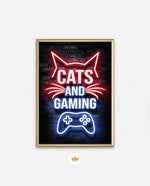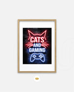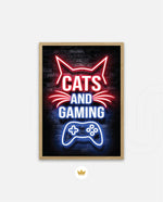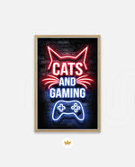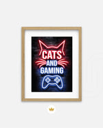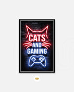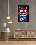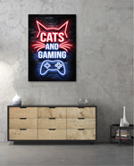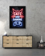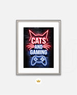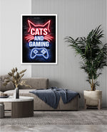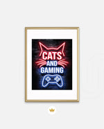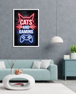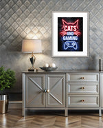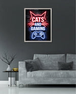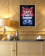 A bold neon artwork featuring a cat outline, gaming text, and controller icon, created as wall art prints and framed wall art for picture frames, photo frames, modern wall art, and creative wall decor, ready to hang.