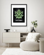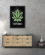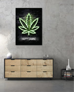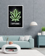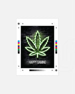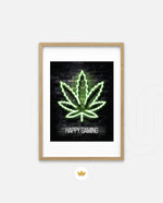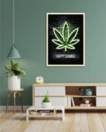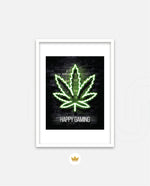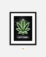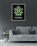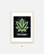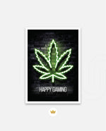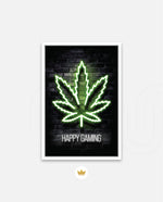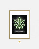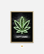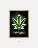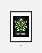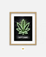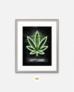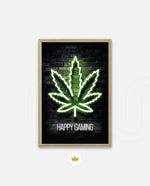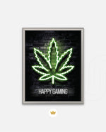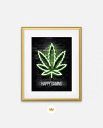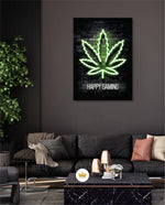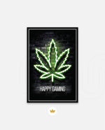 A bold neon-style artwork featuring a glowing green leaf with ÒHappy GamingÓ text, crafted as wall art prints and framed wall art for picture frames, photo frames, modern wall art, creative wall decor, and living room wall art, ready to hang.