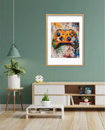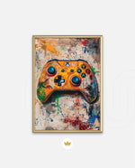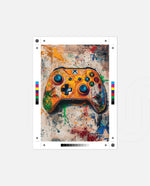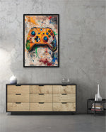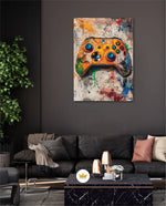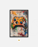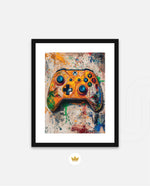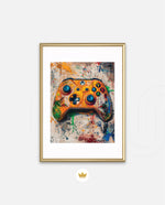 A vibrant gaming controller artwork with bold colors, textured splashes, and a playful edge, designed as wall art prints and framed wall art for picture frames, photo frames, modern wall art, and creative wall decor, ready to hang.
