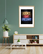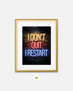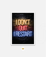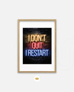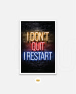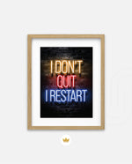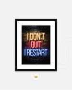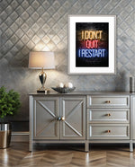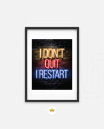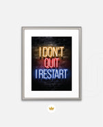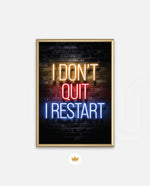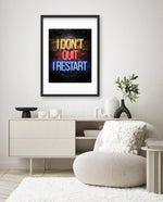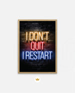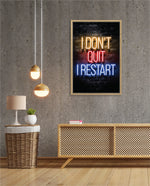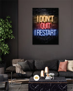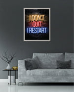 A striking neon quote artwork reading ÒI DonÕt Quit, I Restart,Ó designed as wall art prints and framed wall art for picture frames, photo frames, modern wall art, creative wall decor, and living room wall art, ready to hang.