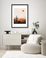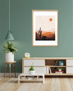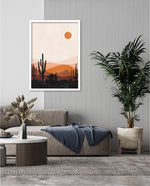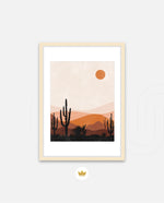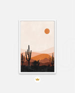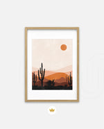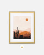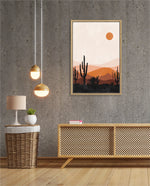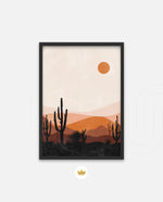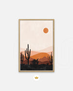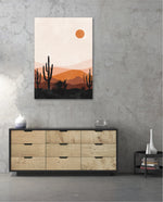 A minimalist desert artwork featuring layered warm-toned dunes, tall cactus silhouettes, and a glowing sun set against a soft textured sky, creating a calm and earthy atmosphere that adds depth and warmth to modern wall spaces, ready to hang.