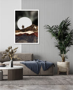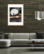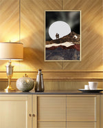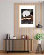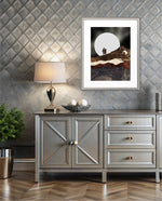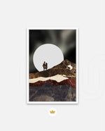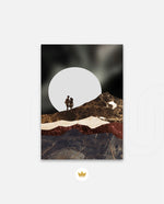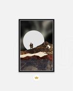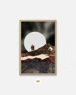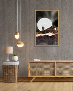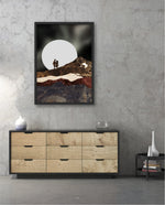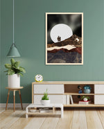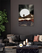 A poetic layered artwork featuring a coupleÕs silhouette standing on textured hills beneath a glowing full moon, blending marble tones and deep night shades to create a calm, emotional, and timeless mood for elegant wall spaces, ready to hang.