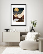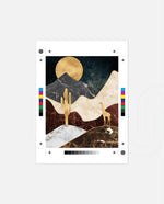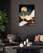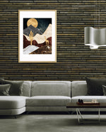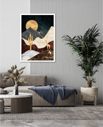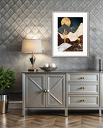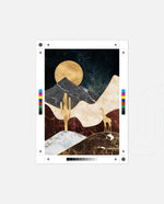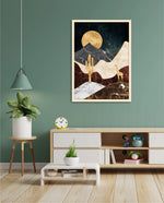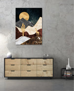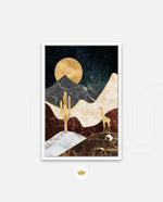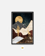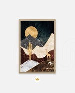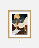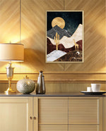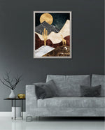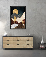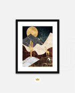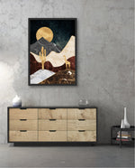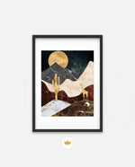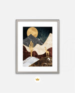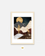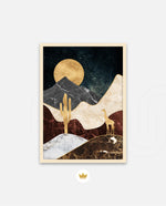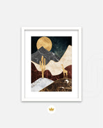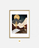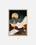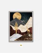 A calm desert night scene with a glowing golden moon, layered marble-textured dunes, a quiet cactus silhouette, and a lone giraffe, blending warmth, depth, and serenity into a refined modern wall artwork, beautifully crafted and ready to hang.