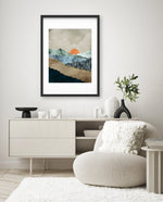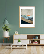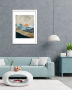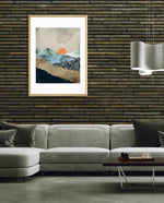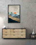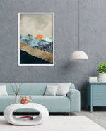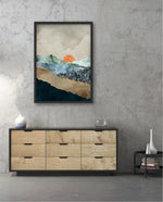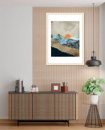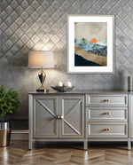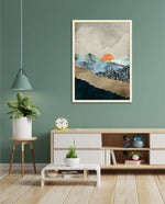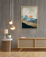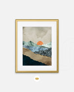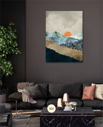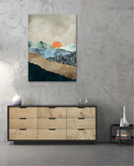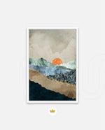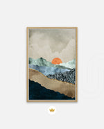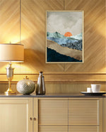A calm abstract landscape of layered textures and soft earthy tones, featuring a muted orange sun resting between gentle mountain forms, creating a peaceful sense of depth, balance, and natural stillness, ready to hang.