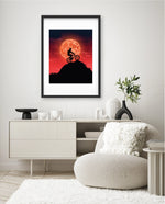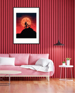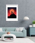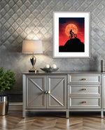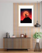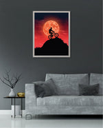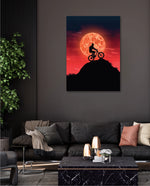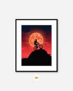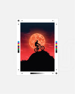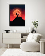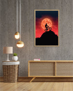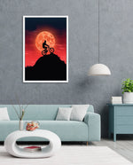 A striking picture frame artwork of a cyclist silhouetted against a glowing full moon in a fiery red sky. This picture frame captures the thrill of adventure and the beauty of moonlit landscapes, adding energy and drama to your décor, ready to hang.