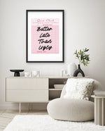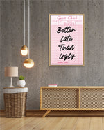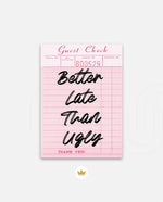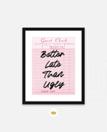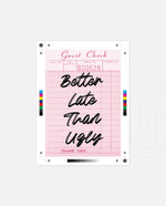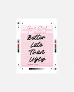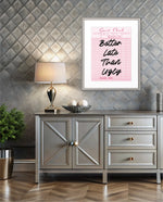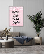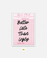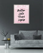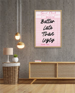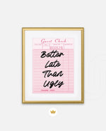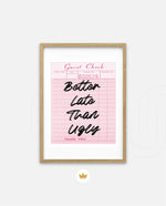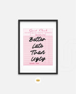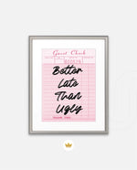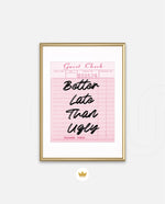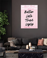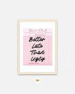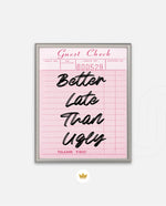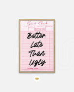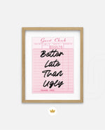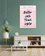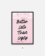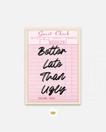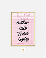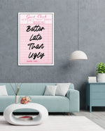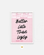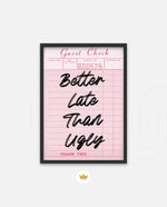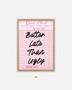 A playful pink receipt-style quote reading Better late than ugly, designed as wall art prints and framed wall art for picture frames and photo frames, adding creative wall decor as modern wall art for living room wall art and decorative wall pieces, ready to hang.