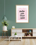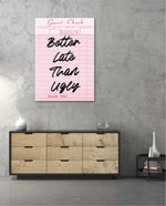 A playful pink receipt-style quote reading Better late than ugly, designed as wall art prints and framed wall art for picture frames and photo frames, adding creative wall decor as modern wall art for living...
