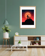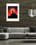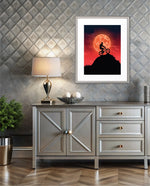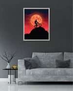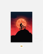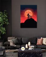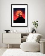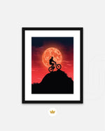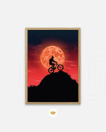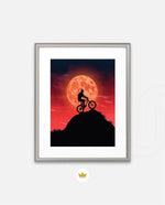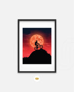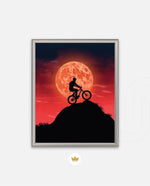 A striking picture frame artwork of a cyclist silhouetted against a glowing full moon in a fiery red sky. This picture frame captures the thrill of adventure and the beauty of moonlit landscapes, adding energy and drama to your dŽcor, ready to hang.
