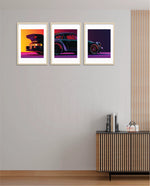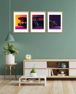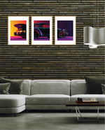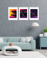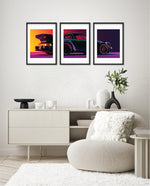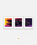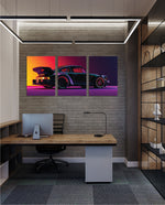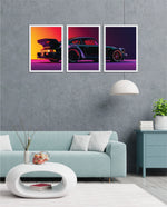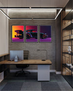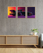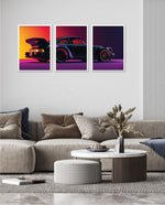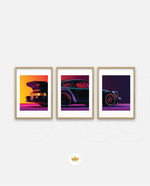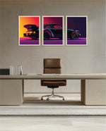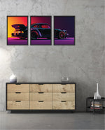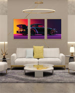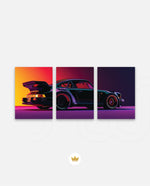 A vibrant picture frame artwork of a classic sports car illuminated by bold neon hues against a dramatic gradient background. Perfect for car enthusiasts and modern interiors, this piece adds energy and style to your wall decor, ready to hang.