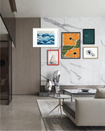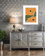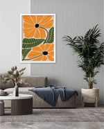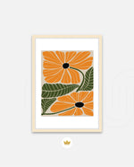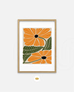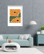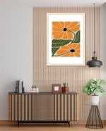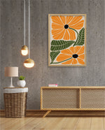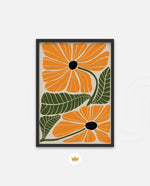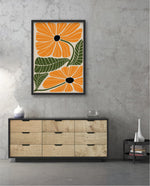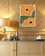 A vibrant floral artwork featuring bold orange blossoms with dark centers and lush green leaves arranged in a playful, organic composition, bringing warmth, freshness, and a cheerful modern touch to contemporary wall spaces, ready to hang.