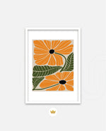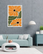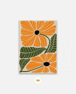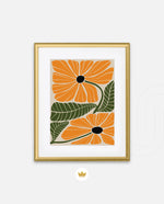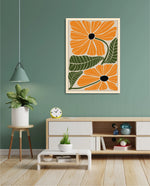 A vibrant floral artwork featuring bold orange blossoms with dark centers and lush green leaves arranged in a playful, organic composition, bringing warmth, freshness, and a cheerful modern touch to contemporary wall spaces, ready to...