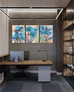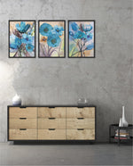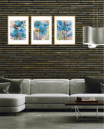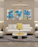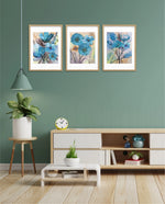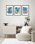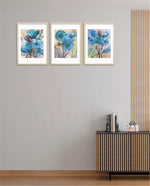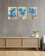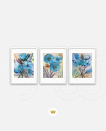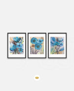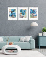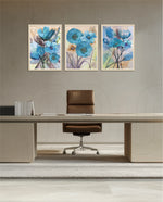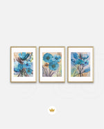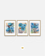 A soft watercolor floral artwork set featuring layered blue blossoms, gentle stems, and pastel washes of beige, green, and lilac, creating a calm and airy composition that brings freshness, light, and modern elegance to contemporary wall spaces, ready to hang.