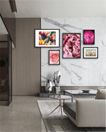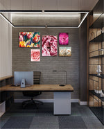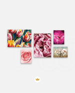 A vibrant floral collage artwork showcasing layered roses, blooming tulips, soft pastel petals, and artistic botanical arrangements blended in a harmonious composition that brings romantic warmth, colour richness, and elegant freshness to modern interior wall spaces, ready to hang.