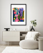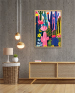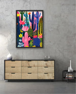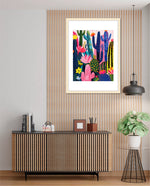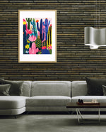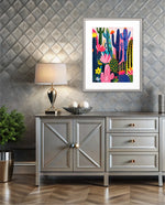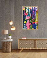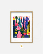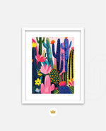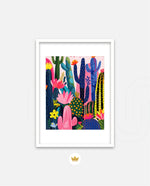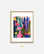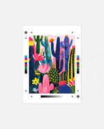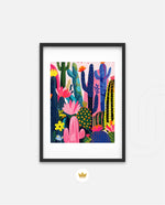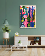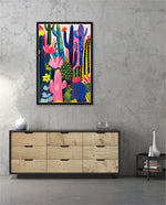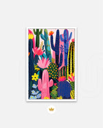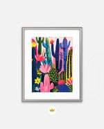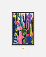 A lively artwork filled with colourful cacti and blooming desert flowers in vibrant pinks, blues, greens, and yellows, creating a playful, energetic, and modern botanical scene, ready to hang.