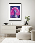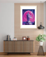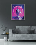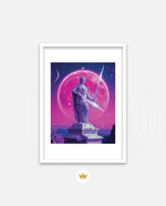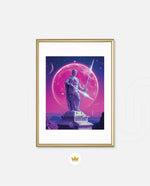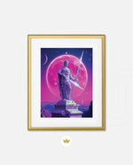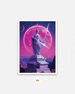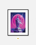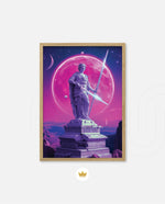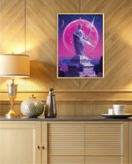 A majestic statue stands beneath a glowing cosmic moon, wielding radiant swords of light. The surreal blend of classical sculpture and futuristic fantasy creates a powerful vision of strength and divine protection. Bathed in vibrant neon tones, the scene evokes an eternal guardian watching over worlds beyond time.
