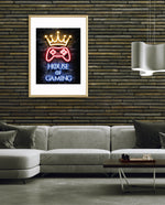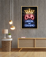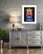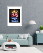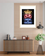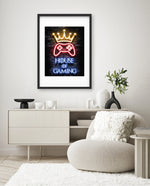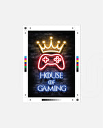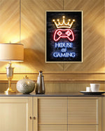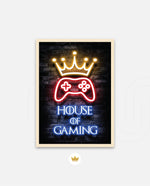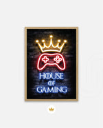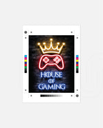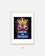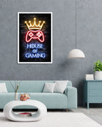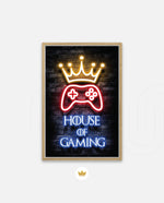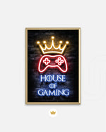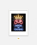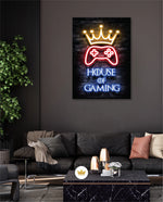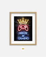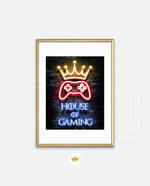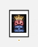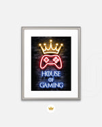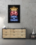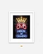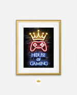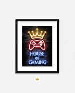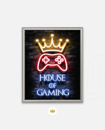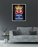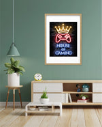 A striking neon artwork featuring a glowing crown and gaming controller with House of Gaming text, designed as wall art prints and framed wall art for picture frames, photo frames, modern wall art, creative wall decor, and living room wall art, ready to hang.