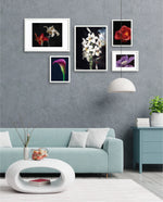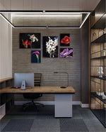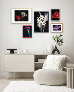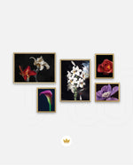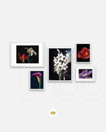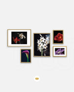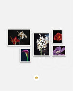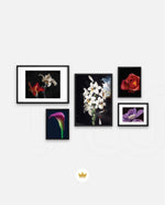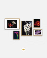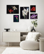 A refined botanical collage artwork featuring a curated collection of elegant blossoms including lilies, roses, and vibrant petals arranged in a gallery-style composition that celebrates colour harmony, texture, and natural beauty for sophisticated interior wall spaces, ready to hang.