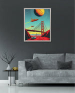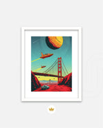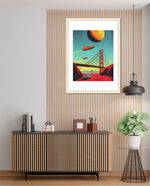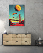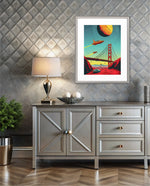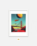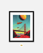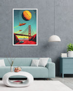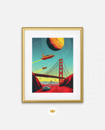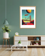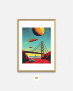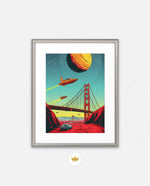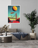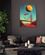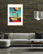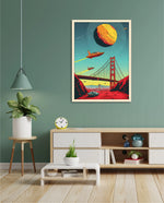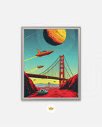 A retro sci-fi cityscape styled as wall art prints and framed wall art for picture frames and photo frames, blending creative wall decor with modern wall art for living room wall art and decorative wall pieces, ready to hang.
