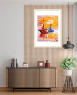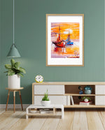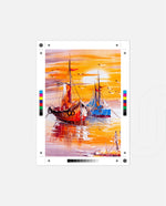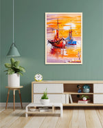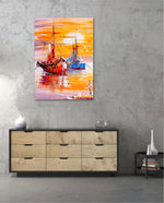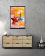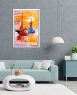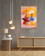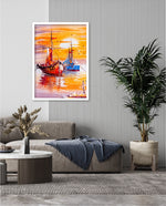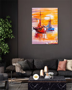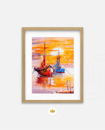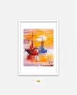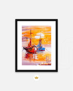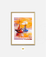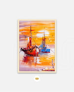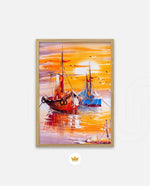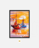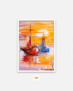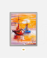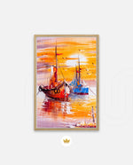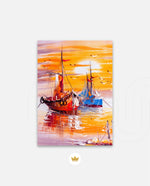 A warm and expressive coastal artwork featuring two fishing boats resting on calm waters under a glowing sunset sky, with soft reflections, flying birds, and rich brush textures that convey serenity, nostalgia, and timeless seaside charm, ready to hang.