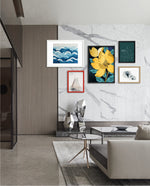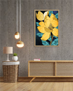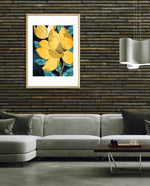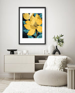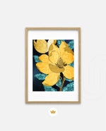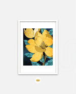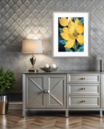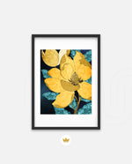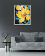 A radiant floral artwork featuring large textured golden petals paired with cool blue leaves and subtle metallic accents, creating a striking balance of warmth, elegance, and modern botanical style, ready to hang.