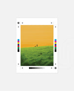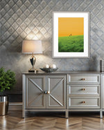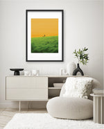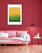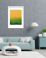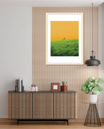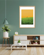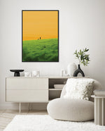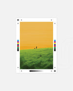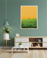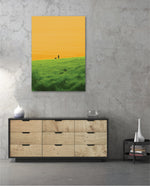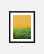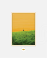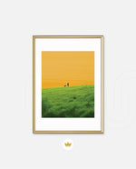 A lone figure and a dog stand on a lush green field, gazing toward a vast golden expanse. The striking contrast of vibrant grass and radiant backdrop evokes wonder, simplicity, and the boundless beauty of open landscapes. This artwork captures the quiet harmony between humanity, nature, and endless possibility.