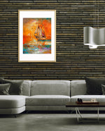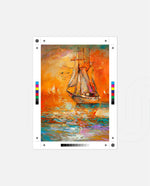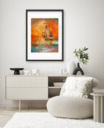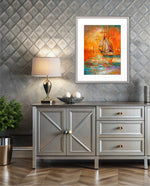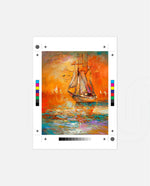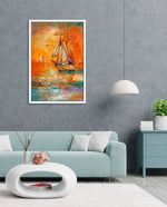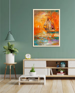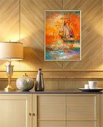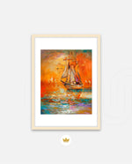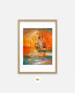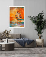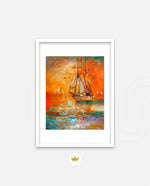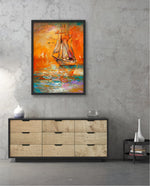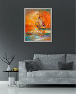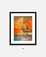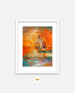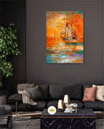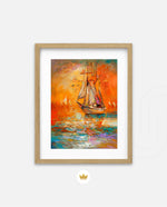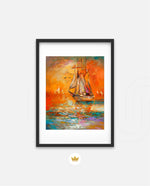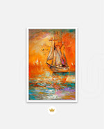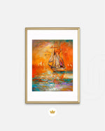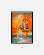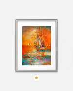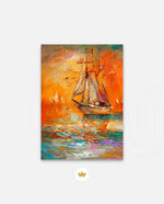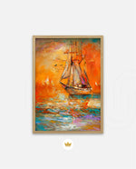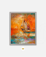 A vibrant seascape painting featuring a classic sailing ship gliding through glowing orange waters under a radiant sunset sky, with textured brushstrokes, soft reflections, and distant sails creating a sense of journey, warmth, and timeless maritime beauty, ready to hang.