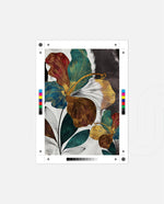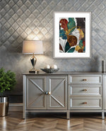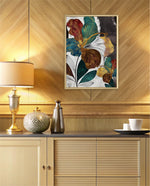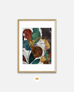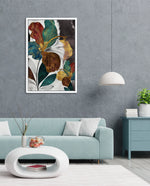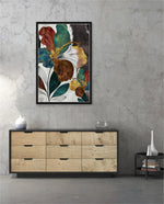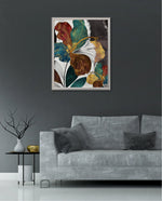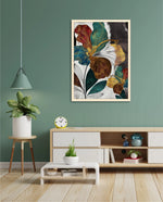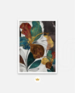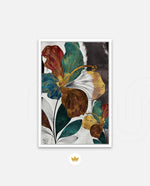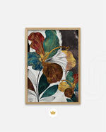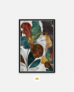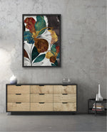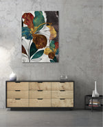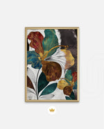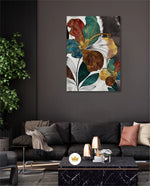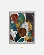 A refined floral artwork featuring large textured petals in teal, gold, and earthy reds, detailed with delicate metallic linework against a soft abstract backdrop, creating an elegant fusion of nature, pattern, and modern artistry, ready to hang.
