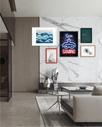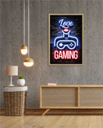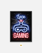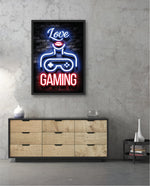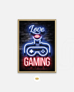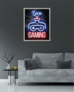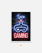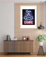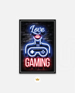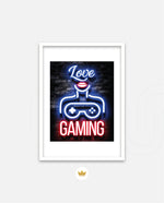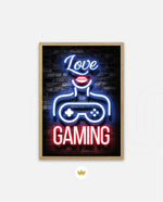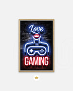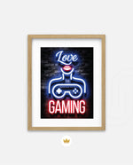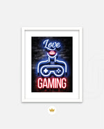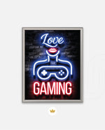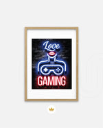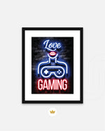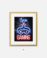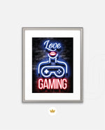A vibrant neon artwork featuring glowing text, lips, and a game controller, designed as wall art prints and framed wall art for picture frames, photo frames, modern wall art, gaming rooms, and decorative wall pieces, ready to hang.