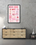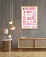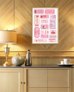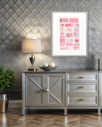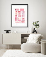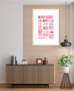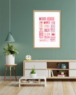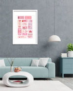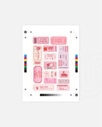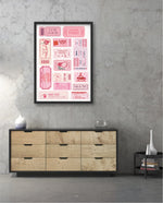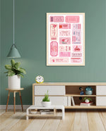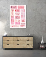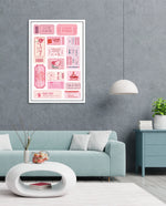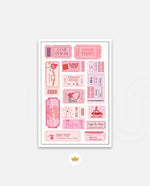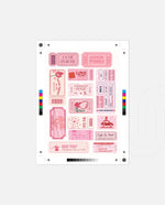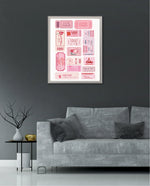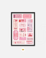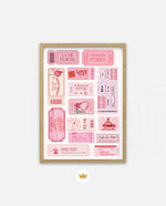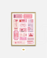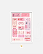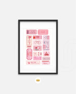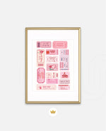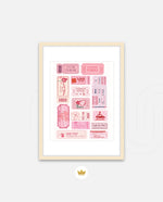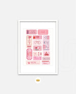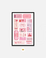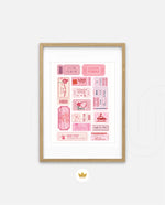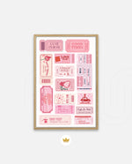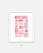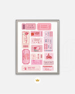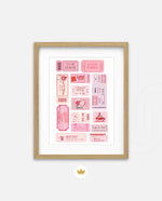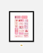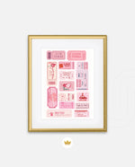 Playful vintage ticket collage in soft pink tones, designed as wall art prints and framed wall art for picture frames and photo frames, adding creative wall decor as modern wall art for living room wall art and decorative wall pieces, ready to hang.