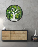 A round wall art piece featuring preserved green moss paired with a laser-cut, 3D raised tree silhouette for a striking natural-meets-art design. Finished with a premium matte spray-painted frame and sealed with a protective lacquer coat, it brings depth, refined texture, and organic beauty to any interior space — ready to hang.