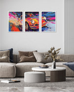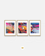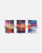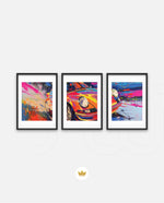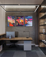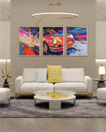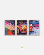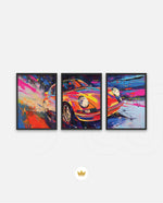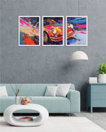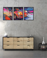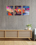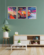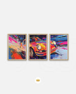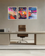A vibrant abstract depiction of a classic sports car in explosive colors, crafted as wall art prints and framed wall art, ideal for picture frames, photo frames, modern wall art, living room wall art, and decorative wall pieces, ready to hang.