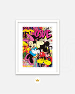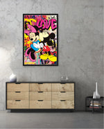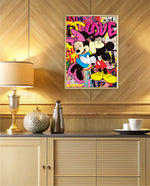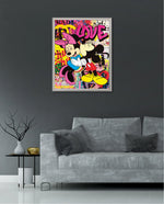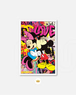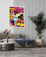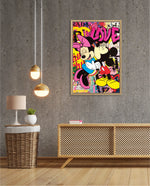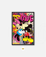 A vibrant pop-art picture frame featuring Mickey and Minnie in a joyful moment of love, surrounded by luxury brand elements, graffiti, and comic-style textures. A playful, colourful statement piece for modern interiors — ready to hang.